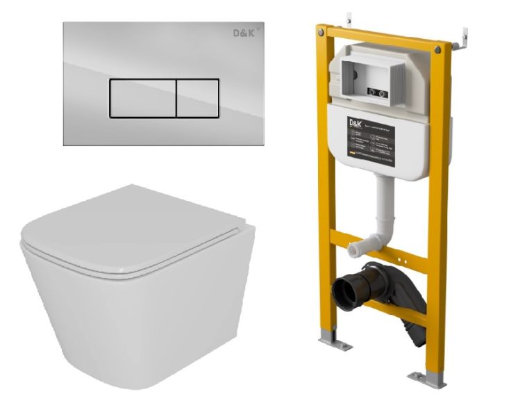 Комплект Унитаз подвесной безободковый (торнадо) DQ Berlin DT1436516, 490*340*350мм, сиденье микролифт, белый+Инсталляция рамная скрытого монтажа DQ DI8050127, 500*117*1270мм, для подвесного унитаза, универсальная+Клавиша смыва DQ Rhein DB1499001, хром