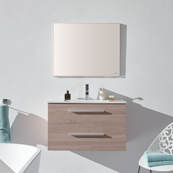1. Многослойное дерево, 2. Два выдвижных ящика с доводчиками 3. Цвет: темный дуб . 4. Зеркало с полкой. 5.Раковина в комплекте.