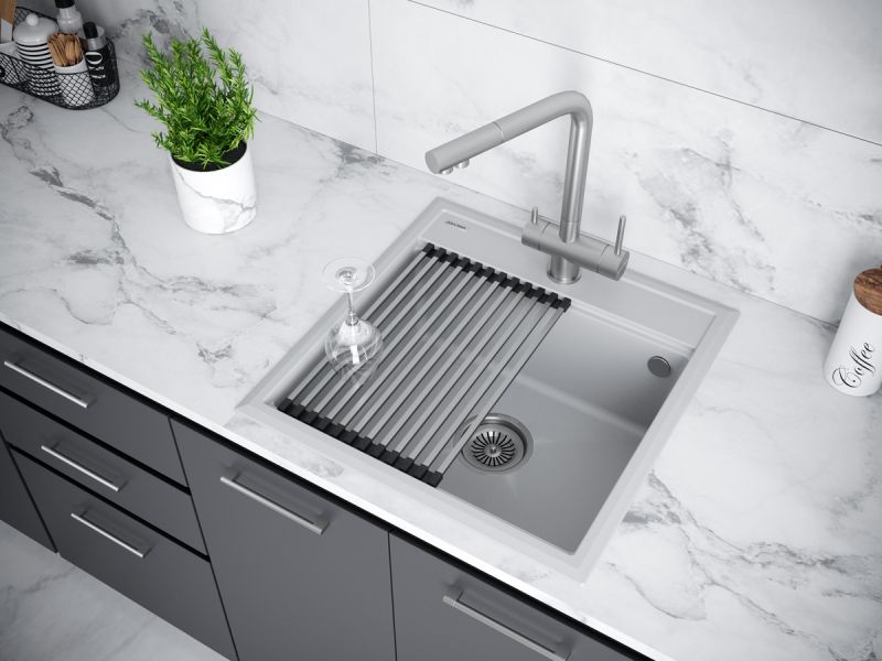 Комплект мойка STEPIA 50 + ролл-мат STEP, PM115051-GRS+R375-BSСтильный и многофункциональный комплект мойки из композитного материала на основе гранита и ролл-мата из высококачественной нержавеющей стали для создания комфортной рабочей зоны на вашей кухне.Мойка STEPIA 50 изготовлена из IT-GRANIT – композитного материала на основе гранита, благодаря чему мойка не потеряет свой первоначальный цвет за многие годы использования даже при длительном воздействии солнечных лучей. Материал мойки устойчив к сколам, царапинам и деформациям. На горизонтальных гранях чаши мойки предусмотрены специальные выступы-ступеньки, которые позволяют использовать такие аксессуары, как ролл-маты, доски, коландеры и пр. для создания дополнительной рабочей поверхности на кухне. Дно чаши мойки имеет 4 грани, направленных к сливу под индивидуальным градусом для максимально быстрого ухода воды.