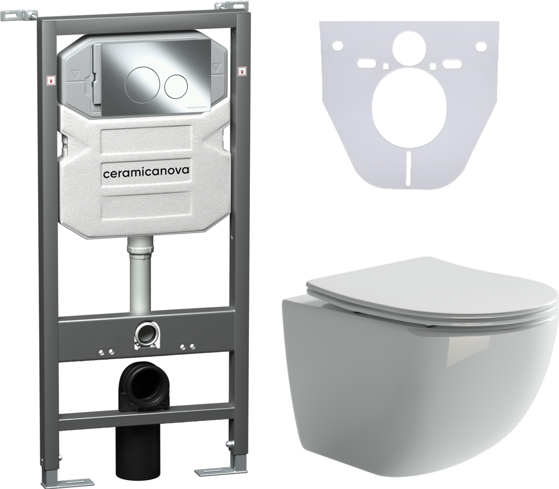 Сет 4 в 1: CN3009_1001CH_1000Подвесной унитаз Forma Rimless арт. CN3009Шумоизоляционная панель для инсталляции арт. CN1000Система инсталляции для унитазов CERAMICANOVA Envision с кнопкой смыва Round цвет хром и креплениями, арт. CN1001CH Подвесной унитаз Ceramica Nova Forma Rimless CN3009 безободковый, с сиденьем Soft Close
