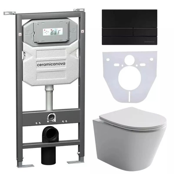 Сет 4 в 1: CN6000_1002B_1000Подвесной унитаз Balearica Rimless арт. CN6000Шумоизоляционная панель для инсталляции арт. CN1000Система инсталляции для унитазов CERAMICANOVA Envision с кнопкой смыва Flat цвет черный матовый, креплениями, арт. CN1002B Подвесной унитаз Balearica Rimless CN6000, глубокий смыв, с крепежом для полностью скрытого монтажа, ультра тонким с сидением и крышкой с функцией плавного закрытия, дюропласт