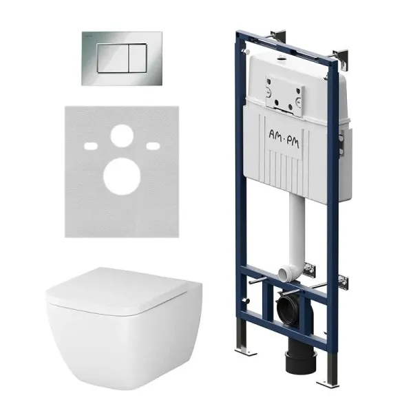 Комплект унитаза с инсталляцией AM.PM Gem IS100251.901701 сиденье микролифтПолностью готовый к установке комплект: система инсталляции с клавишей подвесной унитаз с сиденьем включающий все необходимые крепления патрубки звукоизолирующую прокладку. Экономия пространства благодаря узкому бачку – 120 мм глубиной. Заливной клапан с низким уровнем шума - Класс II согласно европейского стандарта EN 14124. Функция SetUp : Гибкая система крепежа – универсальность и эффективность установочного процесса. Гибко обходит вертикальные и горизонтальные трубы. Высокая прочность и износостойкость. Выдерживает нагрузку до 400 кг. Подходит для унитазов любых размеров. Армированный шланг подачи воды двойная прокладка слива и подачи воды. В комплекте механическая двухрежимная клавиша из ABS пластика в цвете глянцевый хром. Подключение воды сзади сверху. Современный дизайн и трендовая квадратная форма чаши унитаза Gem Flashclean созданные в собственной студии AM.PM Design. FlashClean - новое поколение безободковых унитазов без использования пластика: 100% гигиеничности 0% брызг. Безупречная поверхность: изготовлен из стекловидного фарфора самого гигиеничного и влагостойкого материала. Компактное дизайнерское решение: идеально впишется в санузел любого размера благодаря проекции 50 см. В комплекте быстросъемное сиденье из дюропласта с механизмом плавного закрывания. Материал сиденья дюропласт устойчивый к появлению царапин в сочетании с креплениями из нержавеющей гарантируют долговечность сиденья. Актуальный дизайн сиденья slim wrap-over с однокнопочным механизмом быстрого снятия.