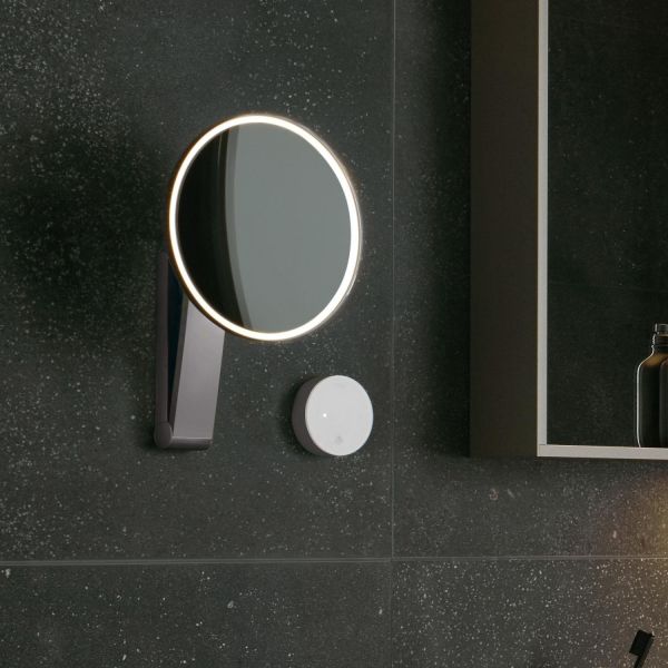 СКосметическое зеркало с подсветкой Keuco iLook move 17612019002 хромKeuco iLook_move 17612019002 Косметическое зеркало с подсветкой (хром). 5-уровневое переключение цвета подсветки от 2700 Кельвин (теплый белый) до 6500 Кельвин (дневной свет), стеклянная панель управления, электрокабель интегрирован в поворотный кронштейн, настенная модель на кронштейне с шарниром, регулируется в трех плоскостях, одностороннее зеркало, вогнутое, коэфффициент увеличения x 5. Управление: Стеклянная сенсорная панель и светодиодный индикатор. Электроснабжение: подключение к сети через подрозетник, 12 В встраиваемый сетевой блок питания, Напряжение на входе: 220-240 В. Потребление в режиме ожидания: < 0,5 Вт. Подсветка: Светодиод 4,5 Вт (срок работы > 50.000 часов). Поставляется вместе со встраиваемым блоком питания и низковольтным соединительным кабелем (500 мм). По причине внутреннего положения кабеля расположение зеркала должно быть определено до отделки стены. Для проводки встраиваемого кабеля и интегрирования блока питания предлагаются подходящие монтажные комплекты в зависимости от структуры стены.