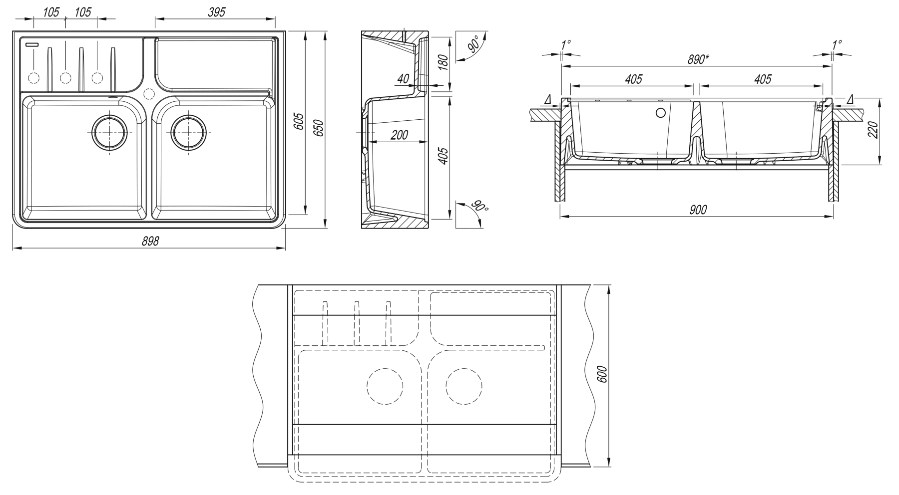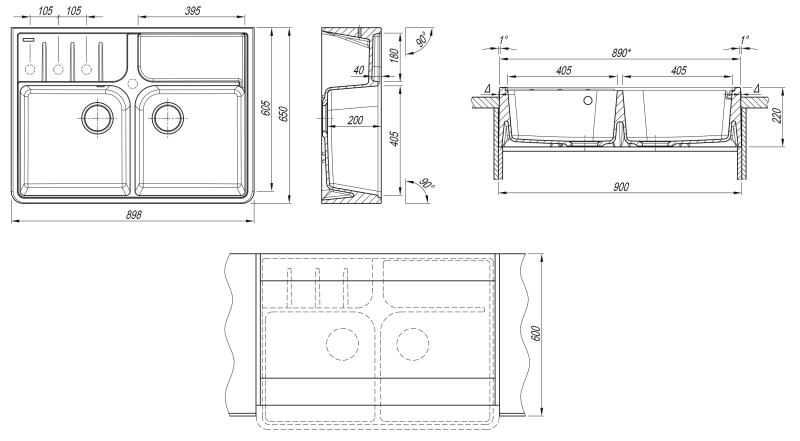 Мойка-блок Вилладжио - это воплощение традиций в современном материале;Две полноценные чаши и широкий постамент для аксессуаров;Предусмотрены дополнительные отверстия под аксессуары.Габариты нетто ( ДхШхВ) 898х650х220 ммТип установки -Накладная ( на отдельный блок между столешниц )