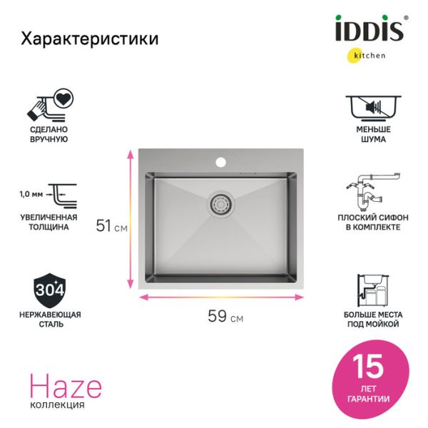 Кухонная мойка IDDIS Haze HAZ59S0i77 51см сталь купить