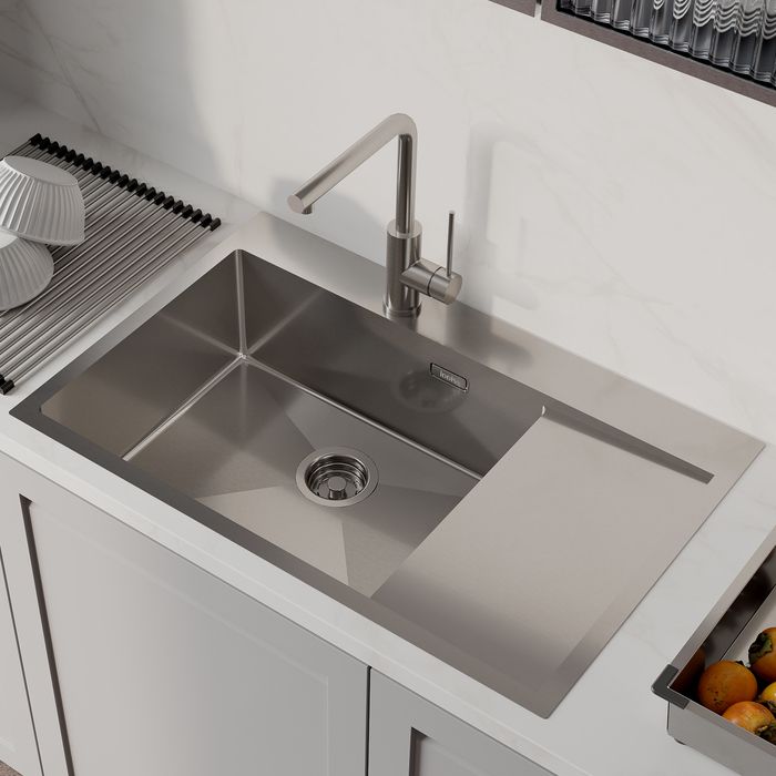 Мойка Haze отличается современным дизайном и ручным методом производства, что позволяет добиться идеальной геометрии – малый радиус скругления углов увеличивает рабочее пространство без «слепых» зон. Удобно разместить много посуды и мыть крупные предметы. Подходит для шкафа от 55 см.