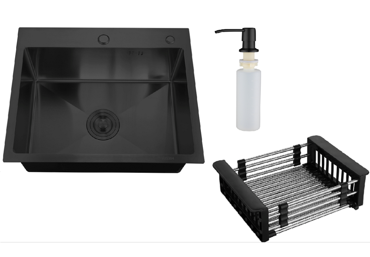 Набор 3 в 1 РМС (кухонная мойка+ корзина раздвижная+ дозатор врезной). В комплекте:евросифон высокого качества.Металлические элементы изготовленны из нержавеющей стали.Гофра с универсальным выходом 40/50. Цвет: воронёная сталь.Размер: 580*430 мм.Глубина: 200 мм.Толщина: 1-3 мм