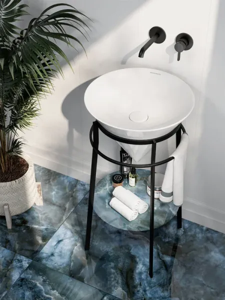 Металлическая структура матовая черная для раковин с бортиком. По периметру расположен большой держатель для полотенца, а ниже предусмотрена установка круглой полки из керамического гранита (3 варианта цвета) или санкерамики (2 варианта цвета) Изделия из ДСП, МДФ, а также изделия из металла требуют правильного ухода и эксплуатации. При установке и дальнейшей эксплуатации изделий, следует обратить внимание на их расположение в ванной комнате: они должны быть установлены вдали от источников тепла; температура воздуха в помещении должна быть в пределах +2 — +25 °С, а влажность воздуха не должна превышать 45%-70%. Во избежание появления пятен, отслоения облицовки и коррозии металла, не допускать скопления воды и жидкостей на поверхностях изделий и как можно скорее протереть сухой мягкой тканью участок, контактирующий с жидкостью. Соблюдайте правила ухода за изделиями из металла и они прослужат Вам очень долго.