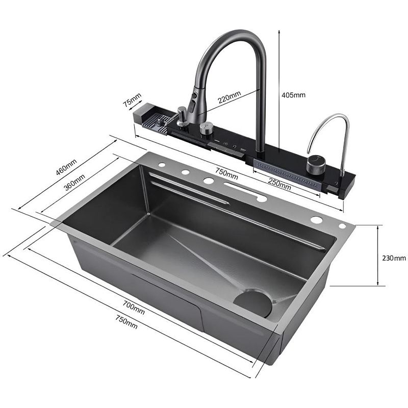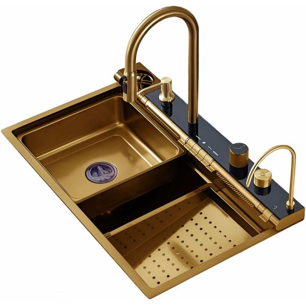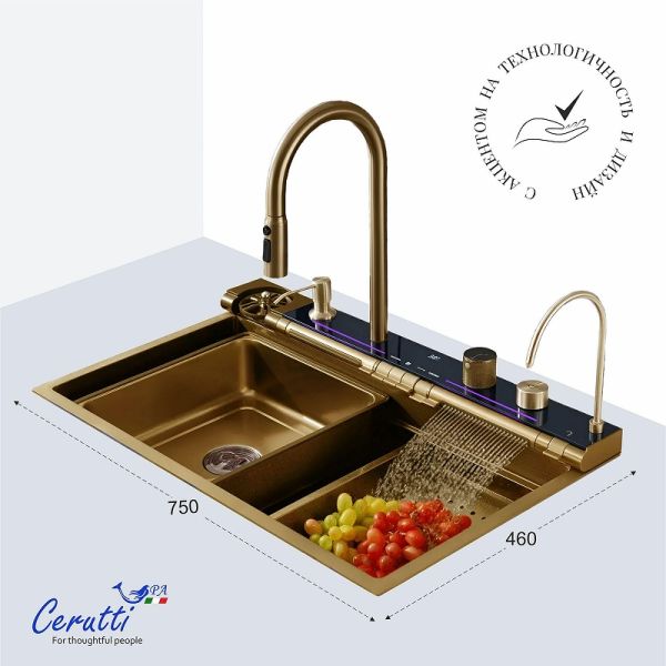 Кухонная мойка Ceruttispa Gloria Pro nano 75 CT11109 многофункциональная. Многофункциональная мойка бренда Ceruttispa, выполненная из нержавеющей стали, толщиной 3 мм – для ценителей комфорта, удобства и порядка на кухне. Она соединила в себе все самые необходимые на кухне аксессуары. Мойка из нержавеющей стали с рифленым PVD покрытием, способствующему ее легкой очистке (поверхность защищена от контакта с маслами и жирами, являющимися основными элементами загрязнения на кухне) и повышенной износостойкости, так как она не подвержена царапинам и на ней не скапливается вода. Панель со встроенным LED-дисплеем, показывает текущую температуру воды и время. Температура регулируется поворотной ручкой. Дисплей не требует подключения к электричеству, так как его работа связана с напором воды. Термостатический смеситель, выполненный из латуни, установлен на панели. Выдвижной излив имеет 3 режима слива воды. Режимы легко переключаются простым нажатием кнопки на аэраторе. Дозатор мыла – нажатием на него сверху легко добавить необходимое количество моющего средства или мыла на загрязненную поверхность. Мойка высокого давления для мытья стаканов – работает при нажатии соответствующей кнопки на панели управления режимами мойки. Встроенный кран для очищенной воды, подходящий под дизайн мойки – нет необходимости приобретать дополнительный кран к установленному у Вас фильтру. Трубку от имеющегося очистителя  воды можно подключить к крану и пользоваться привычной чистой питьевой водой. Клавишная панель переключения режимов – позволяет простым нажатием на клавишу выбрать нужный режим: каскадный водопад/ смеситель/ водопад/ мойка чашек. Слив воды в мойке осуществляется поворотом ручки регулятора. При необходимости Вы можете дополнительно установить измельчитель. Каскадный водопад – используется для мытья фруктов, овощей. Слив водопад – идеален для мытья больших, ровных поверхностей, нуждающихся в интенсивной очистке. Коландер – для удобства разморозки продуктов, для промывки овощей и фруктов, мытья посуды с их дальнейшей сушкой при необходимости. Дополнительное удобство создает специальная рельса на мойке, по которой возможно перемещать коландер в выгодное положение (право/лево). Лоток для замачивания кухонных принадлежностей или продуктов. Дополнительное удобство создает специальная рельса на мойке, по которой возможно перемещать лоток в нужное положение (право/лево). Омыватель для стаканов подсоединяется к блоку отдельно. Разделочная доска из дерева – возможно ее использование как отдельно (на столешнице), так и в самой мойке при установке на рельсы мойки. Характеристики:
