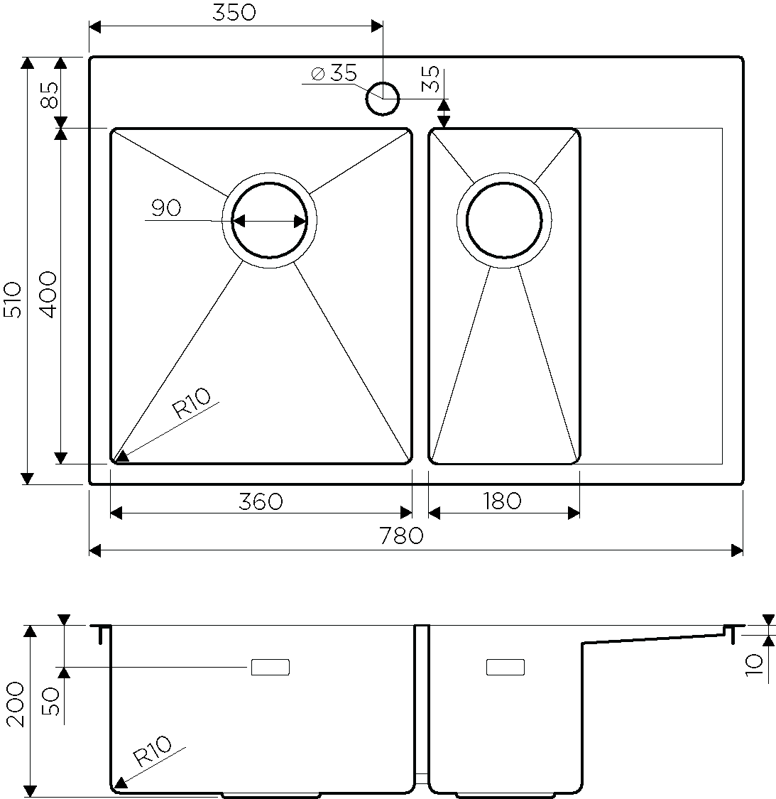 • Отверстия под смеситель: