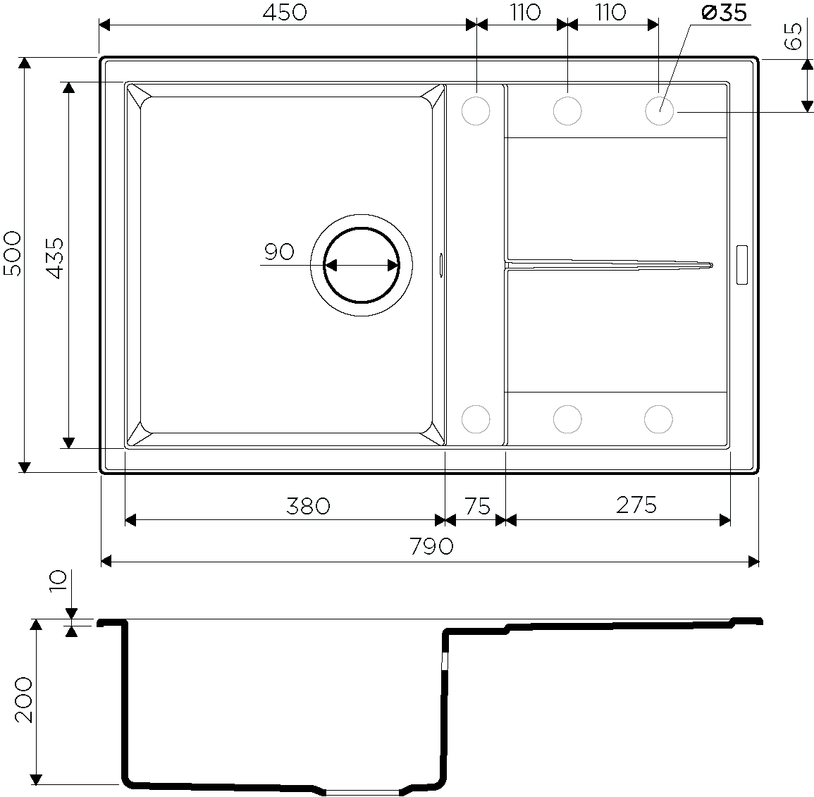• Отверстия под смеситель: