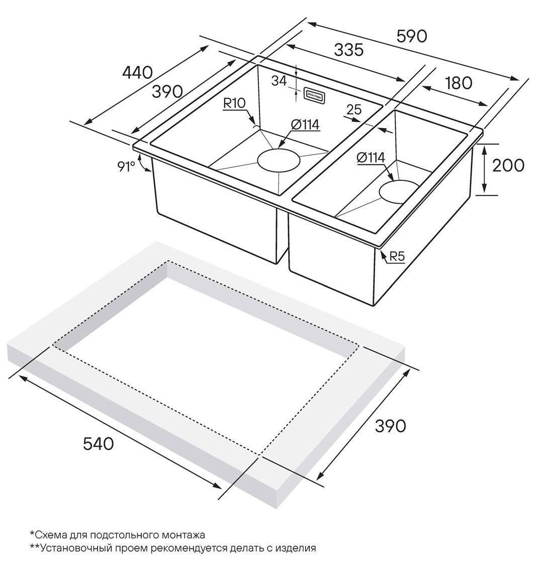 • Отверстия под смеситель: