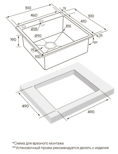 • Отверстия под смеситель: