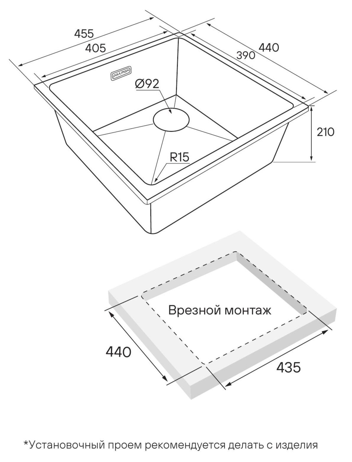 Мойка создана как для современного способа монтажа под столешницу, так и для классического врезного монтажа.Смещенный слив
