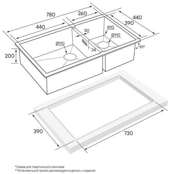 • Отверстия под смеситель: