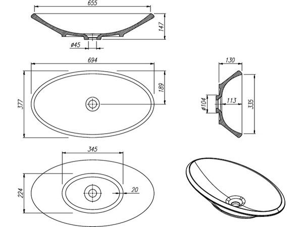 ? Монтаж: накладной? Материал: кварцевый композит? Размер: 694х377х147 мм? Комплектация: сифон МИНИ 1 1/4" х40 с нержавеющим выпуском 63мм, накладкой Агура и гибкой трубой (1 ½ - Ø40/50)