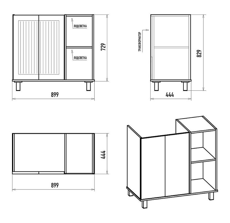Габариты корпуса тумбы (ШхВхД): 899х829х444 мм.