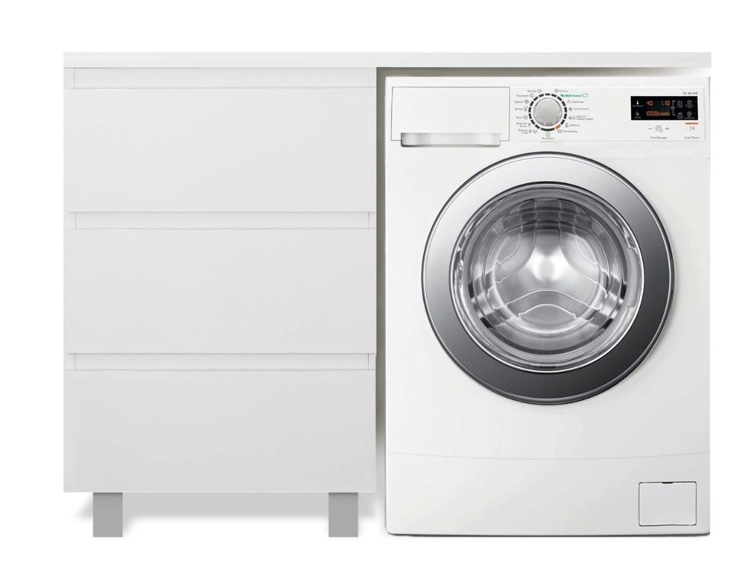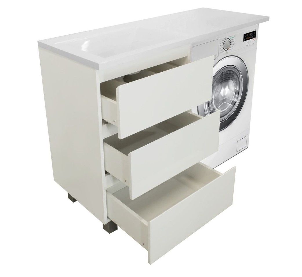 Приоритетом в выборе тумбы с раковиной является площадь ванной комнаты. Функциональная тумба с тремя ящиками решит вопрос для большинства покупателей. Тумба укомплектована раковиной из литьевого мрамора с удобной чашей, стиральная машина устанавливается под столешницей. Три ящика позволят распределить как крупные, так и мелкие вещи.