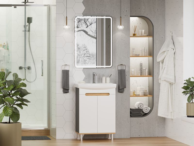 Напольная тумба под раковину Misty Сканди 60см белый/дуб крафт золотой/антрацит