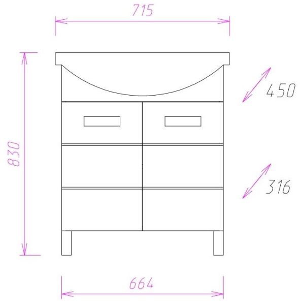 Размеры тумбы без учета раковины и ножек: 66x31x68 см.