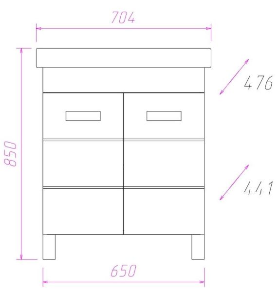 Размеры тумбы без учета раковины и ножек: 65x44x67 см.