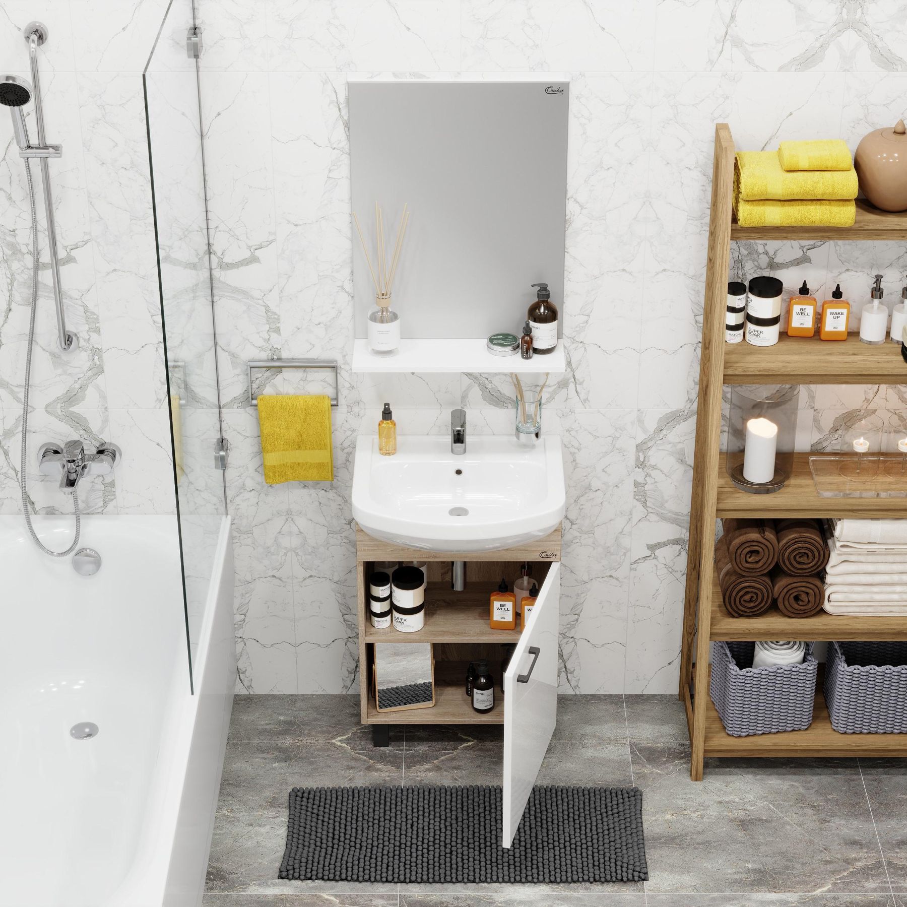 Компактные габариты позволяют грамотно организовать небольшой санузел, а белый фасад и корпус цвета дуба гармонично сочетаются с черной фурнитурой и отлично впишутся в интерьер любой ванной комнаты.