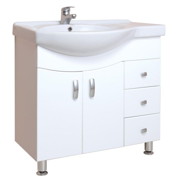 В тумбе Onika Эльбрус 82 белоснежный глянец фасада подчеркивается оригинальной хромированной фурнитурой и сложной изысканной геометрией линий.