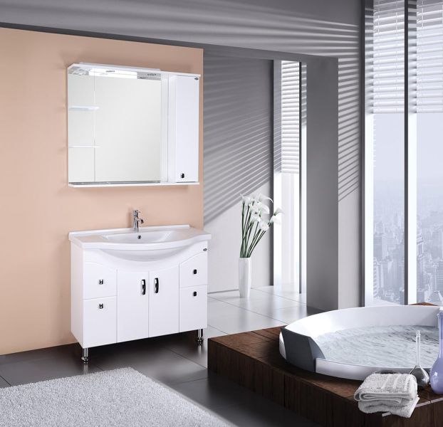 В тумбе Onika Эльбрус 100 белоснежный глянец фасада подчеркивается оригинальной хромированной фурнитурой и сложной изысканной геометрией линий.