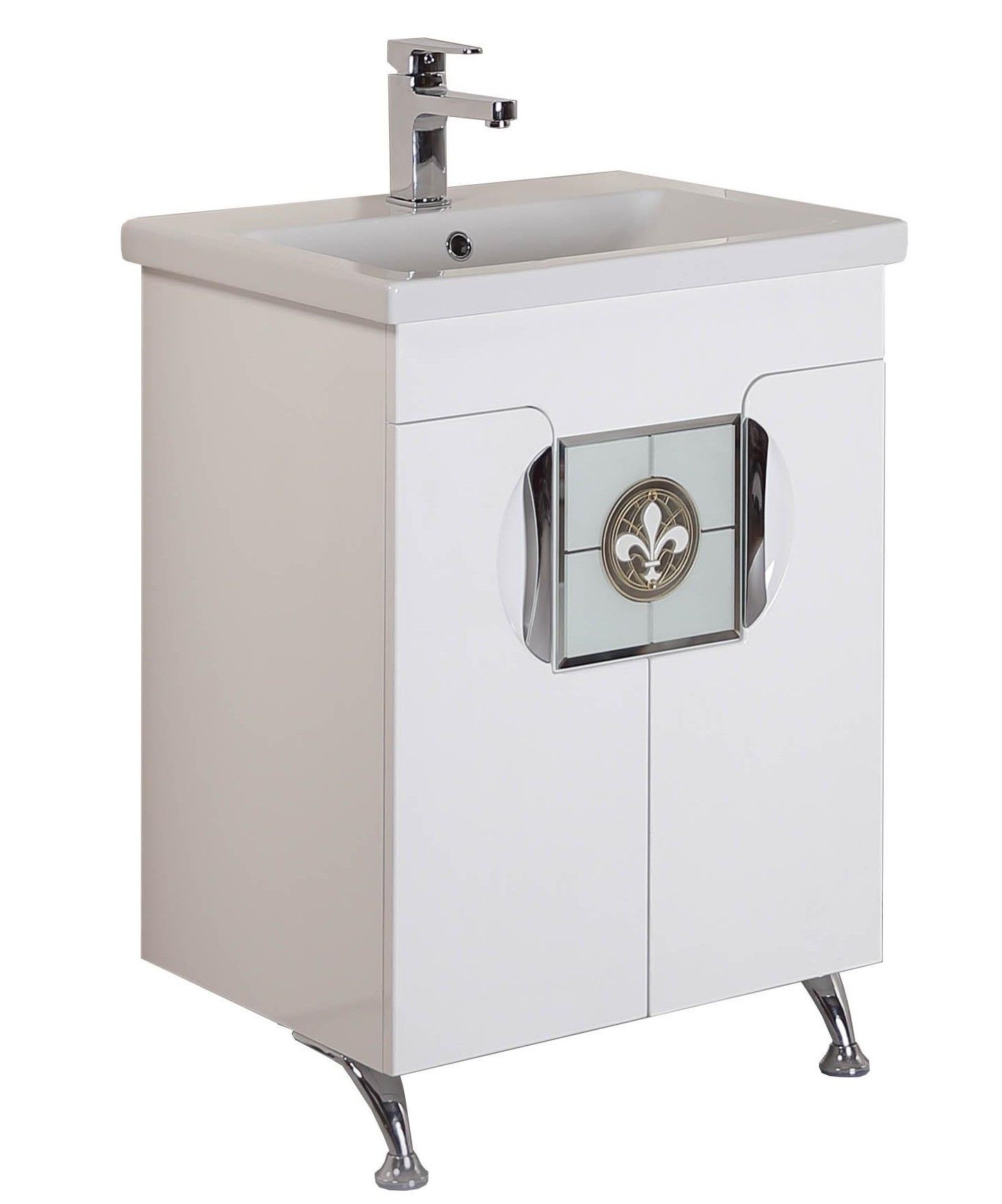 Глянцевый белый цвет подчеркивается врезными хромированными ручками, изысканный стиль тумбы дополняет декоративный витраж на зеркальном полотне.
