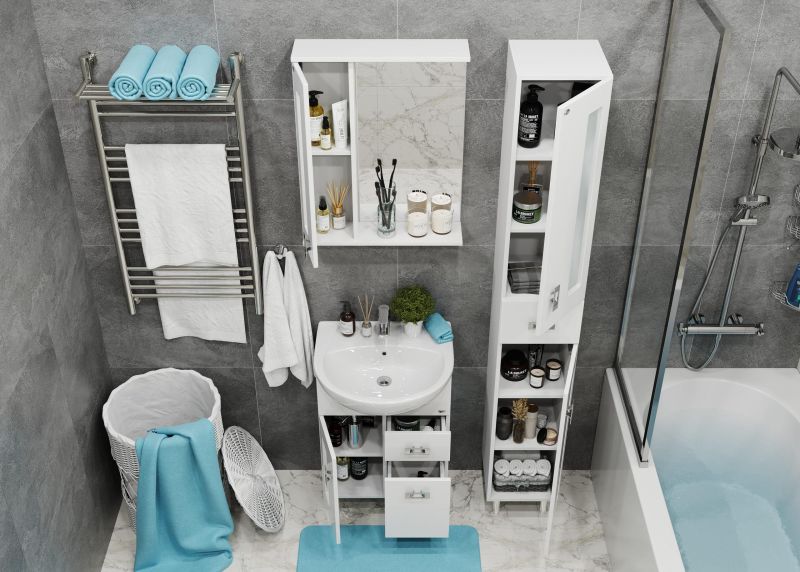 Белоснежный глянцевый цвет фасада в сочетании со вставками из матового стекла и хромированными ручками необычной формы придадут ванной комнате ощущение свежести, чистоты и уюта.