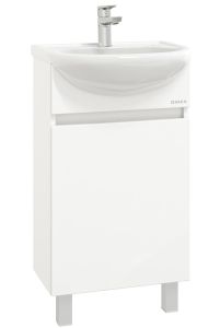 Тумба имеет белый глянцевый фасад и строгие формы без декора. За дверцей с интегрированной ручкой скрывается пространство с полкой для размещения необходимых бытовых принадлежностей.