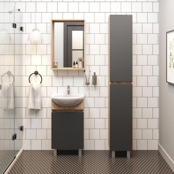 Тумба сочетает в себе красоту и функциональность: серый матовый фасад с покрытием SoftTouch, корпус цвета дуб сонома с роскошной текстурой, строгие формы без декора. За дверцей с интегрированной ручкой скрывается пространство с полкой для размещения необходимых бытовых принадлежностей.