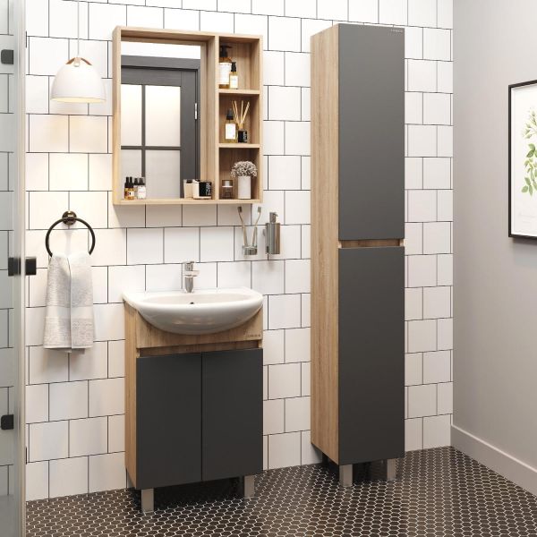 Тумба сочетает в себе красоту и функциональность: серый матовый фасад с покрытием SoftTouch, корпус цвета дуб сонома с роскошной текстурой, строгие формы без декора. За дверцей с интегрированной ручкой скрывается пространство с полкой для размещения необходимых бытовых принадлежностей.