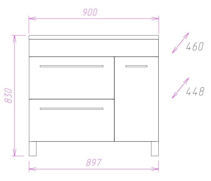 Размеры тумбы без учета раковины и ножек 90x45x71 cм.