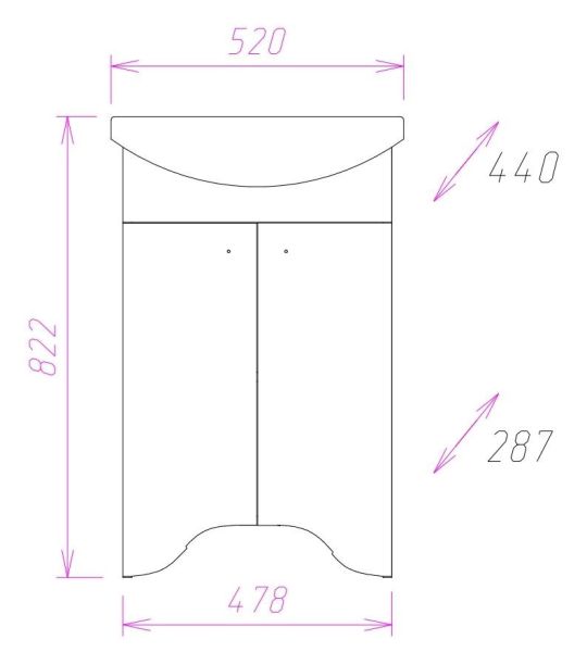 Тумба максимально удобна в использовании: две распашные дверцы скрывают пространство для хранения, разделенное горизонтальной полкой и позволяющее компактно разместить бытовые принадлежности.