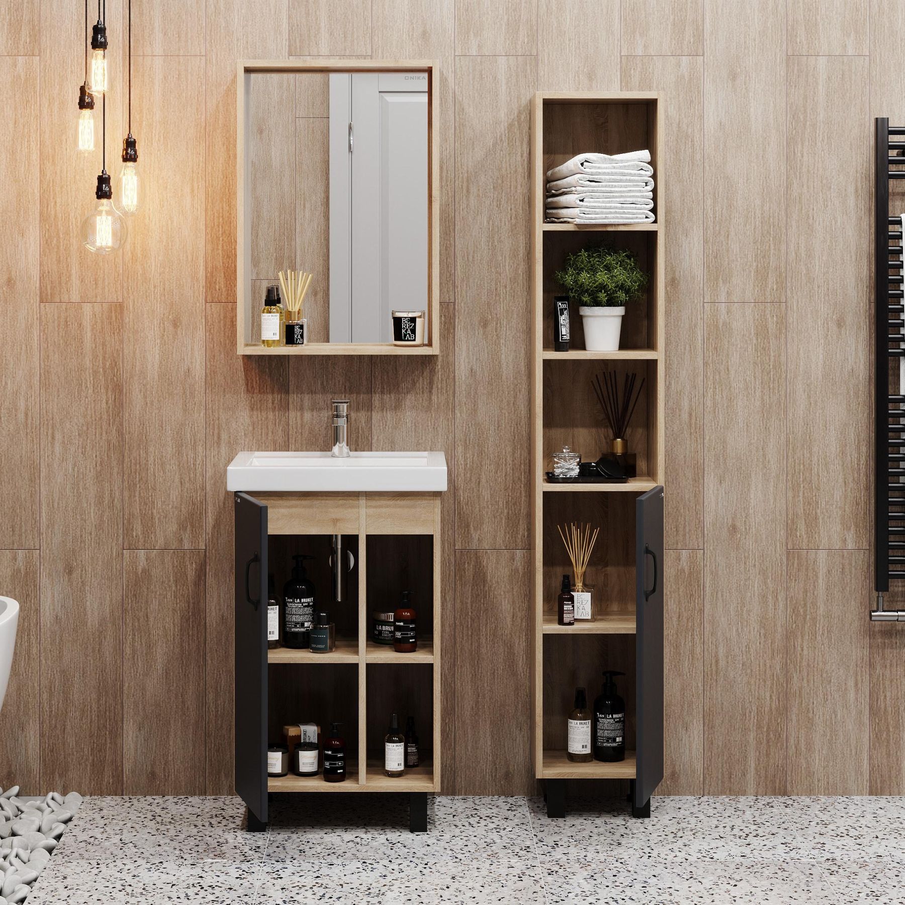 Открытые полки справа обеспечивают быстрый доступ к часто используемым аксессуарам, а пространство за распашной дверцей слева, снабженной системой плавного закрывания, станет удобным местом для хранения различных бытовых принадлежностей.