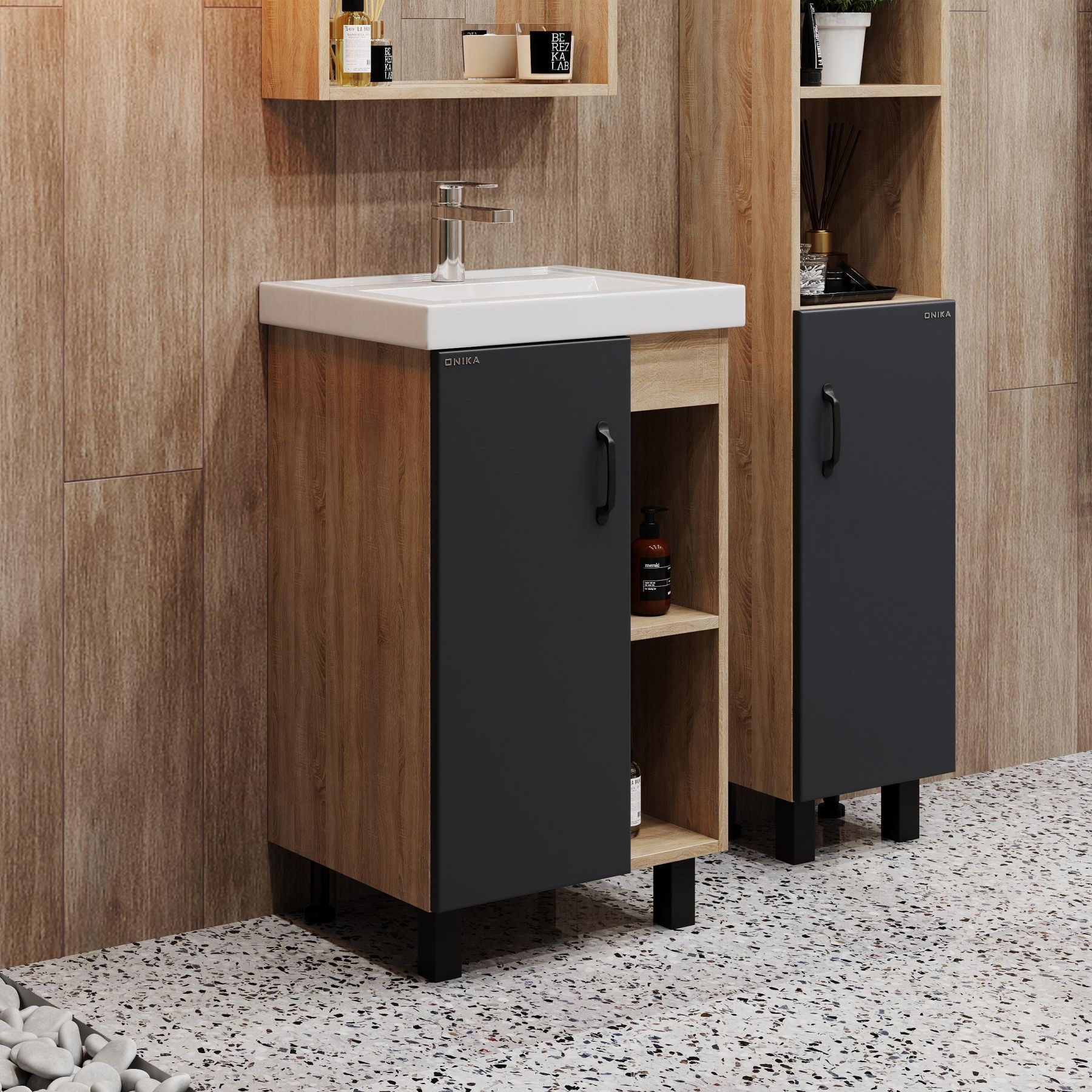 В тумбе Onika Тимбер 50 удачно сочетаются контрастные цвета и фактуры: серый матовый фасад с покрытием SoftTouch, корпус цвета дуба с роскошной текстурой, черная матовая металлическая фурнитура.