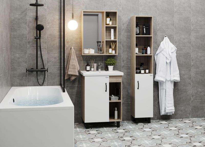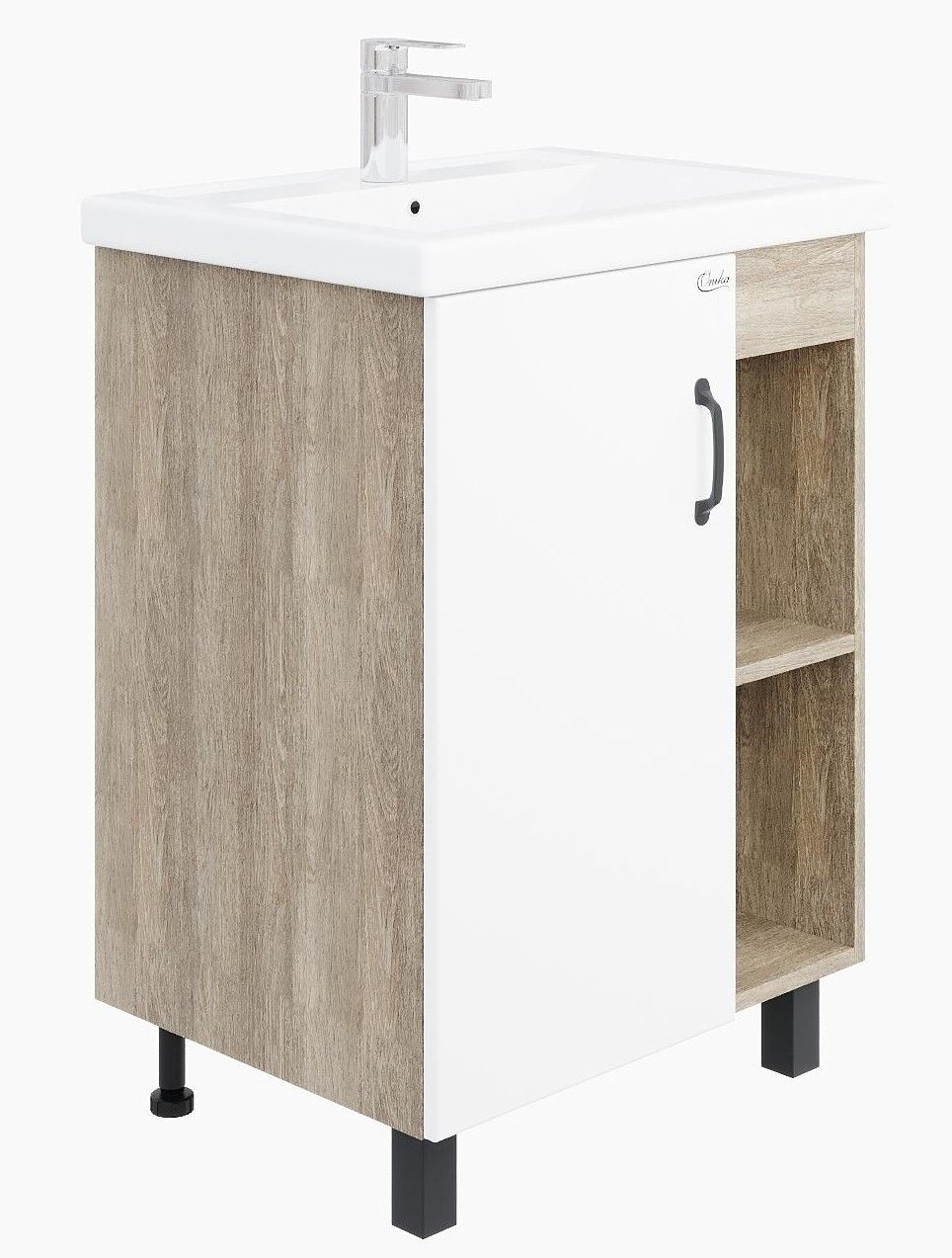 В тумбе Onika Тимбер 60 удачно сочетаются контрастные цвета и фактуры: белый матовый фасад с покрытием SoftTouch, корпус цвета дуба с роскошной текстурой, черная матовая металлическая фурнитура.