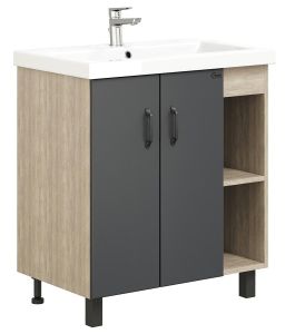 В тумбе Onika Тимбер 70 удачно сочетаются контрастные цвета и фактуры: серый матовый фасад с покрытием SoftTouch, корпус цвета дуба с роскошной текстурой, черная матовая металлическая фурнитура.