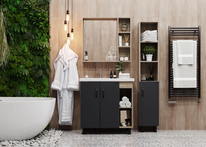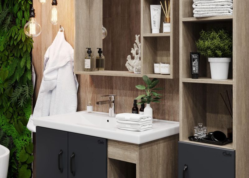 В тумбе Onika Тимбер 80 удачно сочетаются контрастные цвета и фактуры: серый матовый фасад с покрытием SoftTouch, корпус цвета дуба с роскошной текстурой, черная матовая металлическая фурнитура.