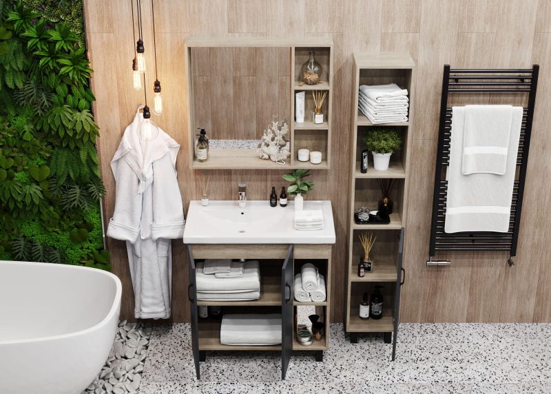 Открытые полки справа обеспечивают быстрый доступ к часто используемым аксессуарам, а пространство за распашными дверцами слева, снабженными системой плавного закрывания, станет удобным местом для хранения различных бытовых принадлежностей.