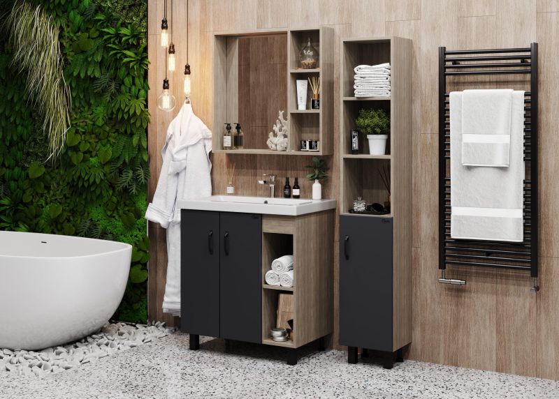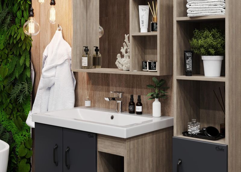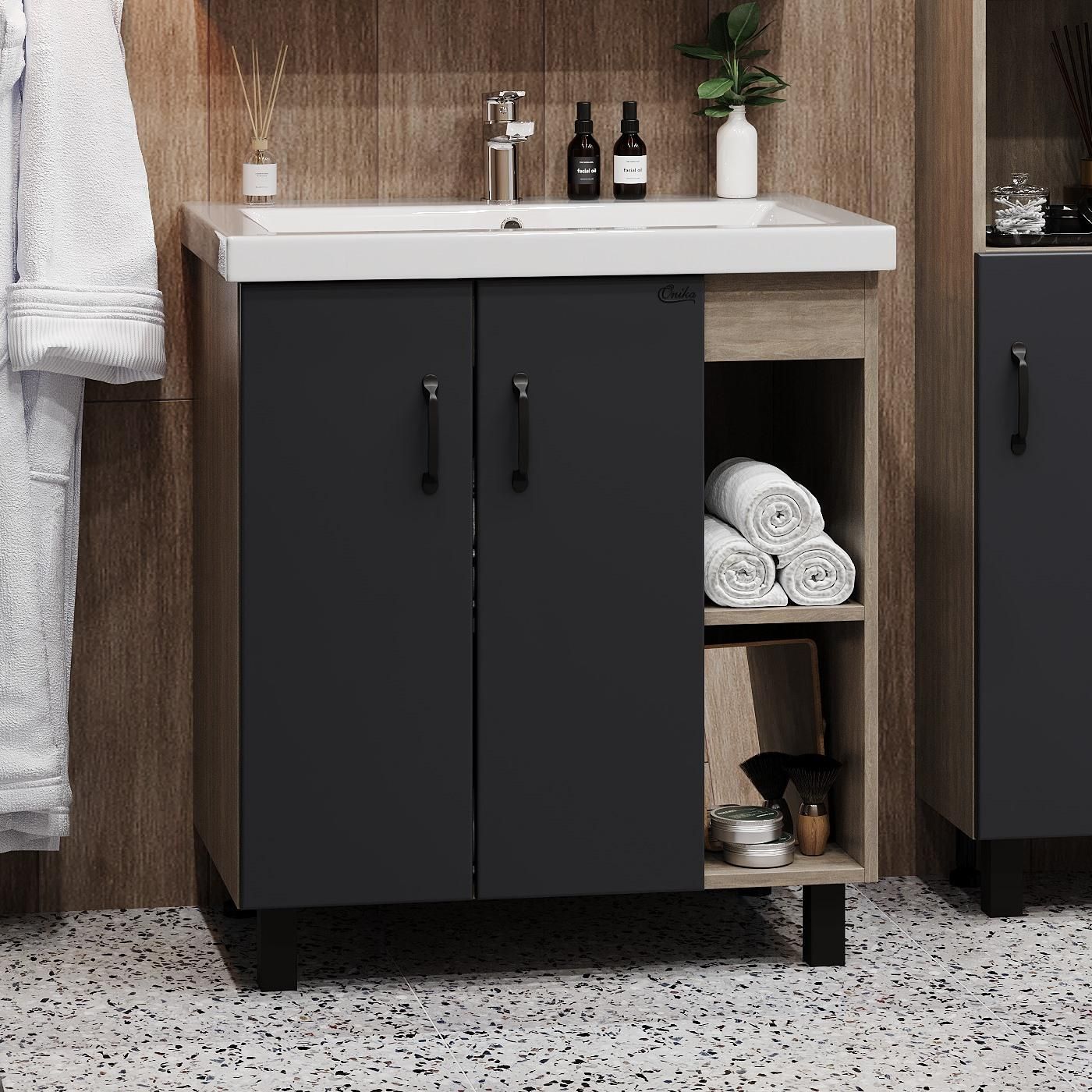 В тумбе Onika Тимбер 80 удачно сочетаются контрастные цвета и фактуры: серый матовый фасад с покрытием SoftTouch, корпус цвета дуба с роскошной текстурой, черная матовая металлическая фурнитура.