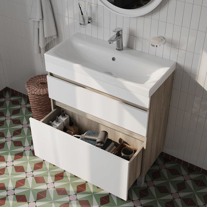 Напольная тумба с раковиной IDDIS Zodiac ZOD8ABFi95K с ящиками 80см белый/под дерево