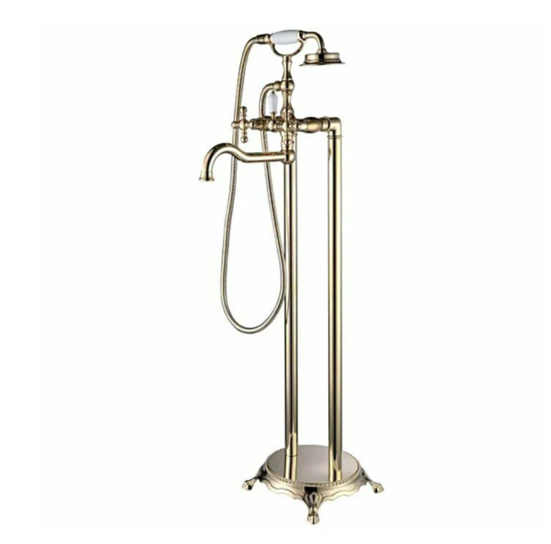 Смеситель для ванны Gappo G3089-6 напольный — двухвентильная модель в ретро-стиле с отделкой "золото", с изящными опорами и поворотным изливом. Смеситель оснащен однорежимной душевой лейкой и шлангом.