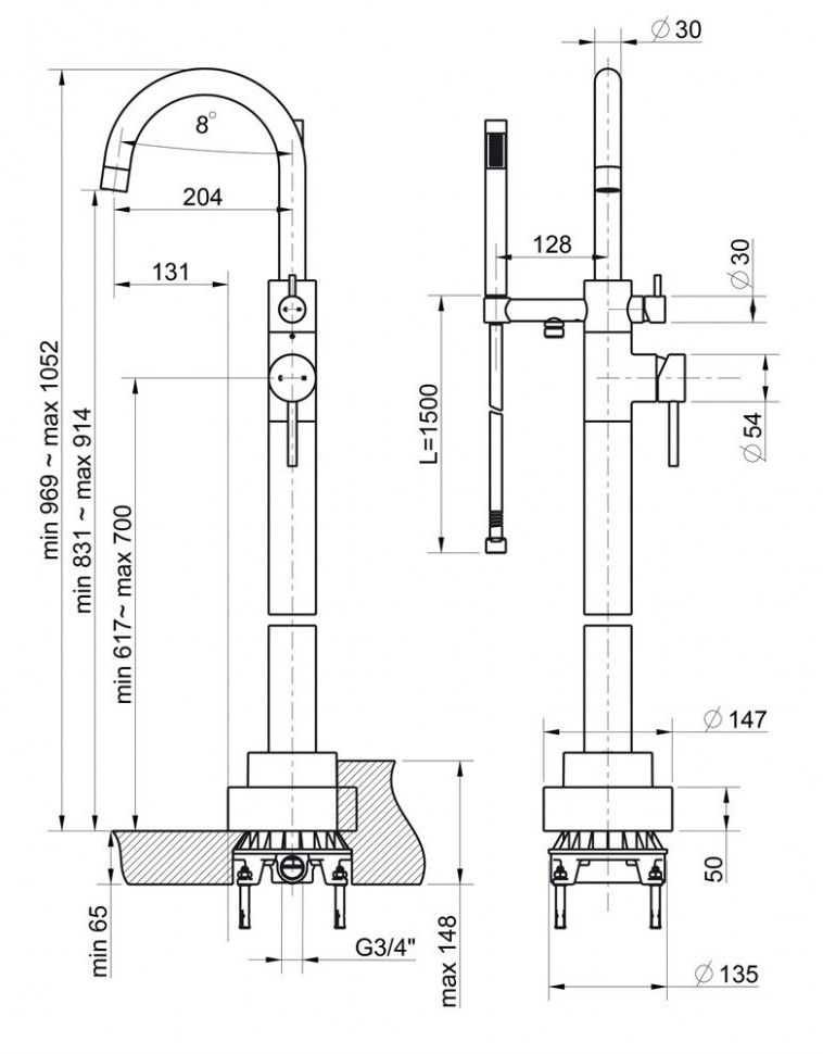 - Напольное расположение и высота смесителя позволяют установку в бассейн, сауну или станут новаторским решением для отдельно стоящей ванны.