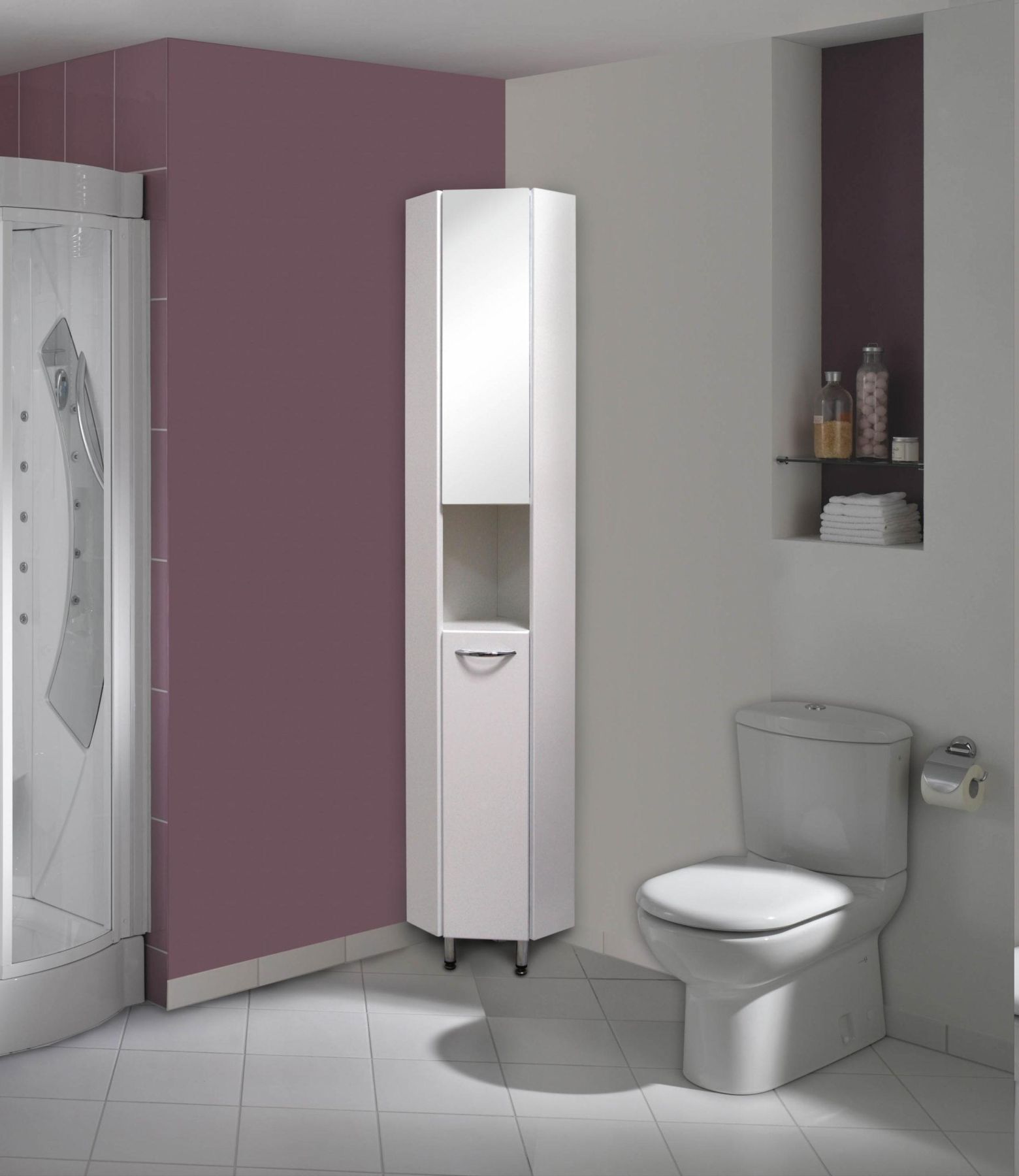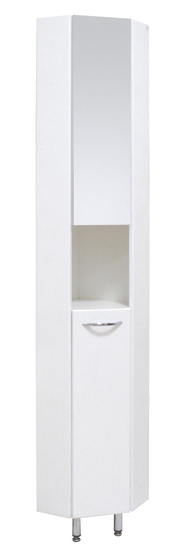 Белая глянцевая поверхность, простая узкая ручка и минималистичный дизайн подойдет к любому интерьеру, а открытая полка посередине и два больших отделения за распашными дверями (верхняя дверь является зеркалом!) - отличное место для хранения необходимых вещей.