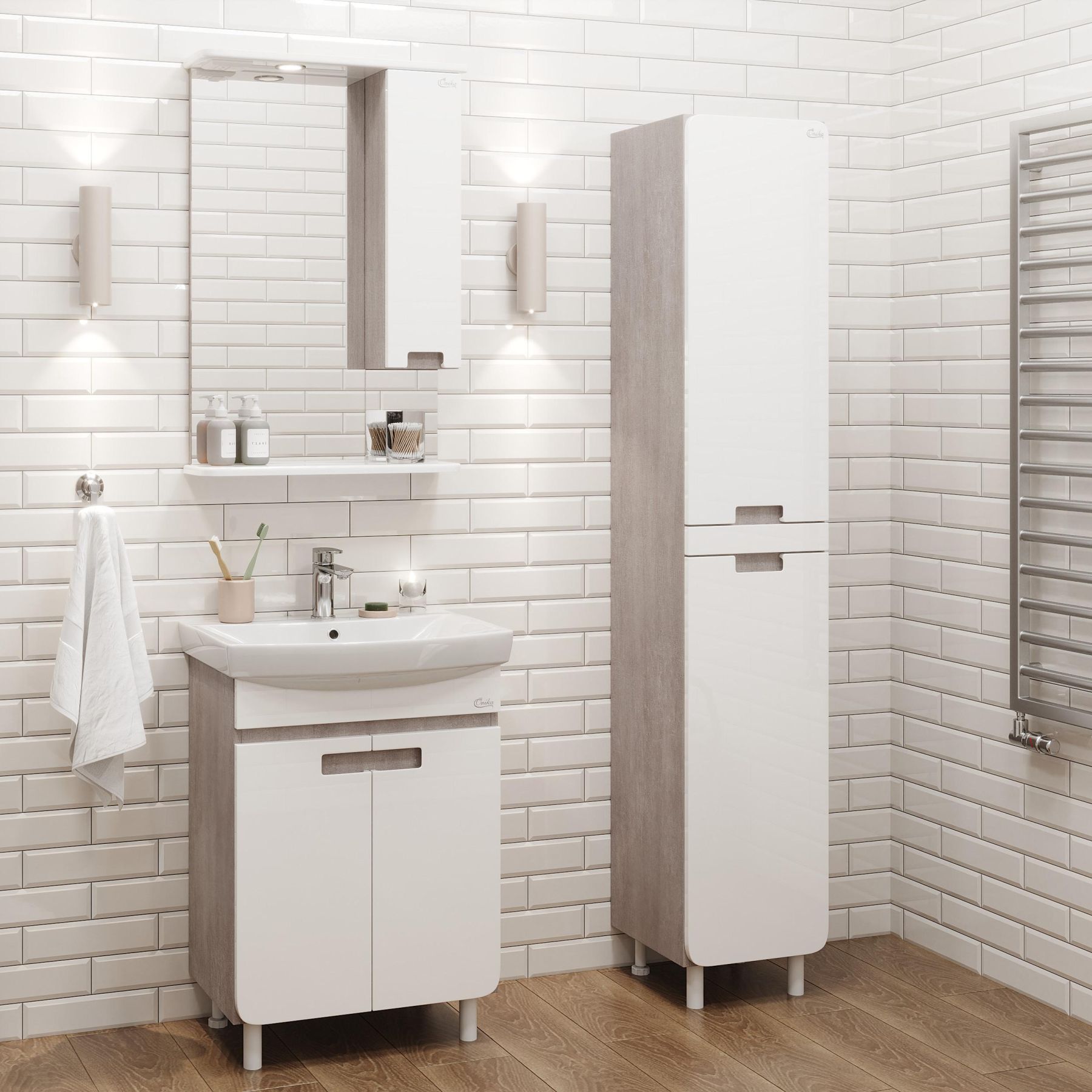 Ункальность пенала в его дизайне: корпус цвета бетона и фактурой мешковины отлично сочетается с белым глянцевым фасадом с закругленными углами.
