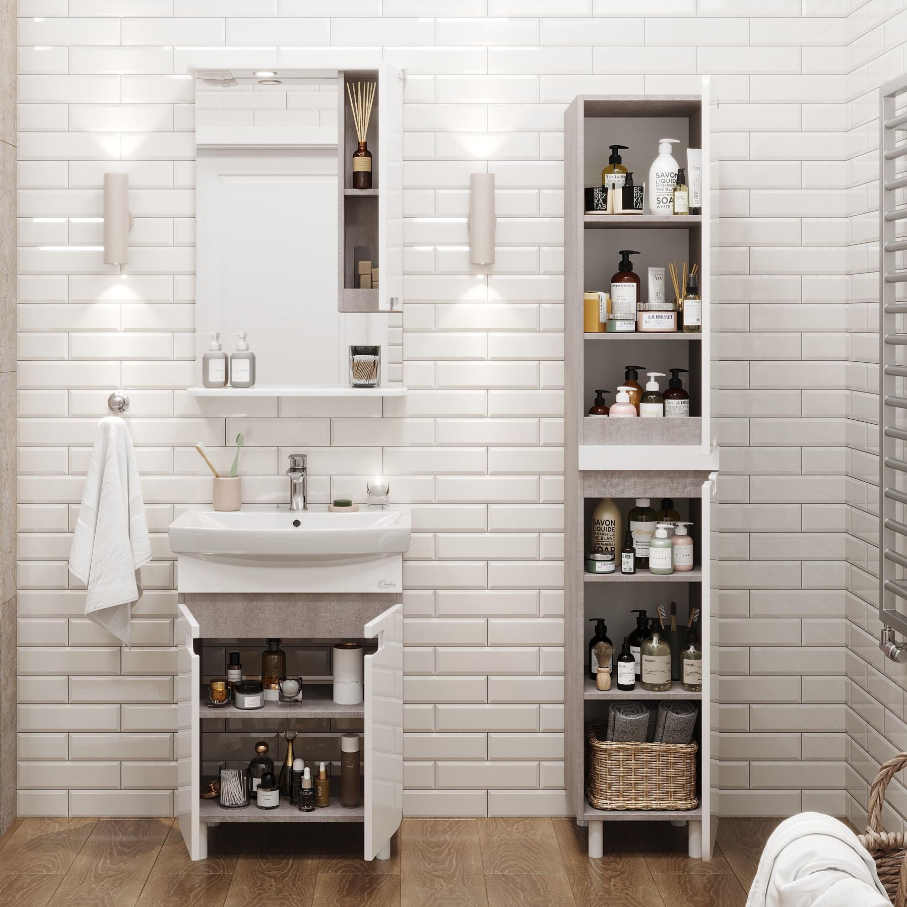 Пенал имеет универсальную ориентацию: при установке верх и низ пенала можно менять местами, а дверцы могут открываться как влево, так и вправо.