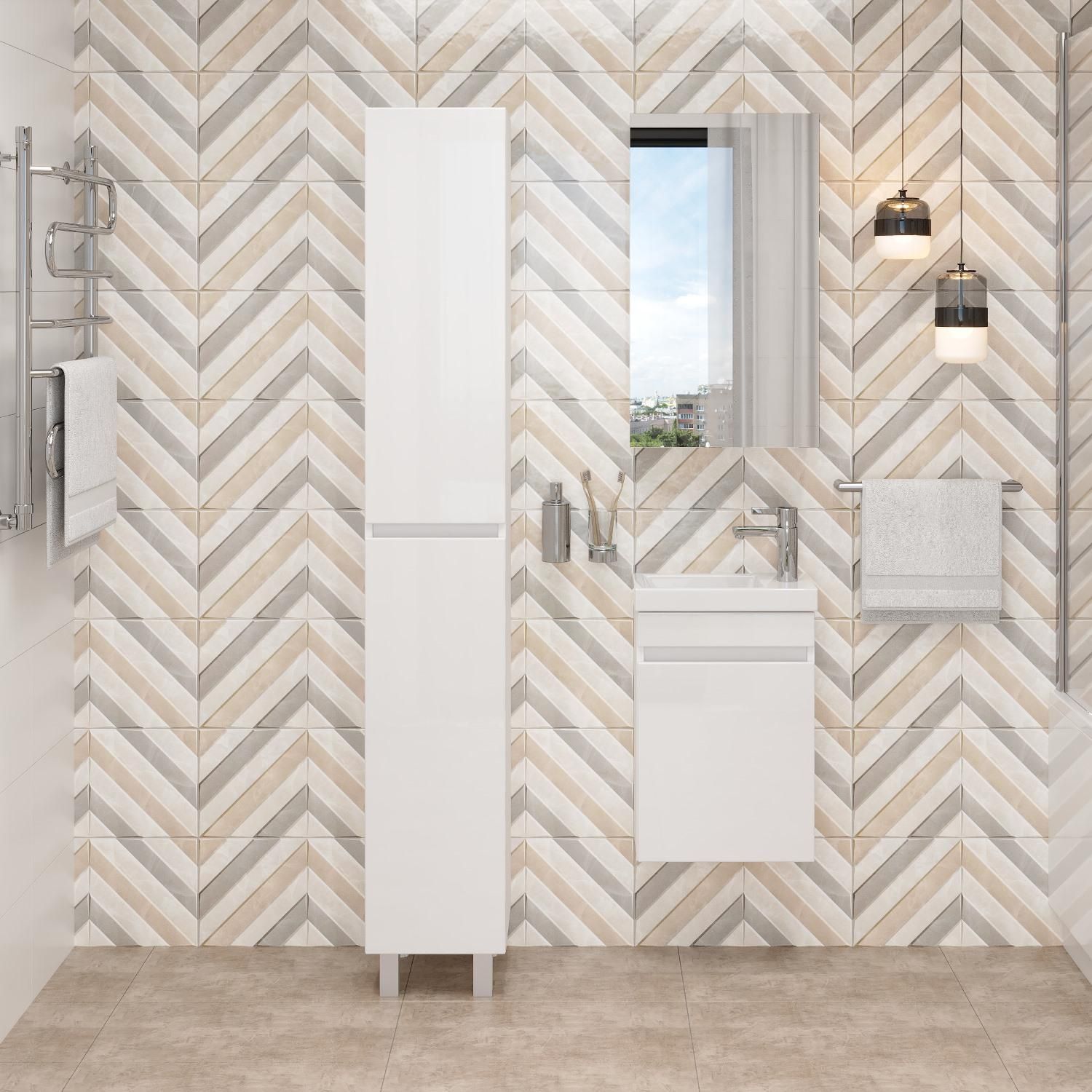 Корпус пенала выполнен из ЛДСП, фасад - из МДФ в пленке, специально предназначенных для использования в условиях высокой влажности.