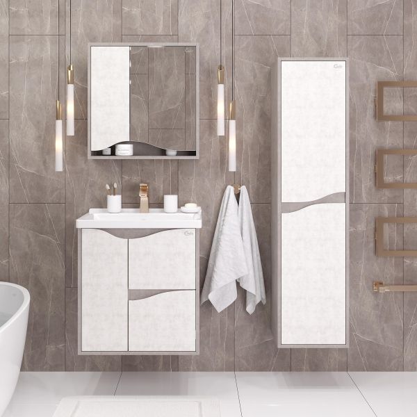 Корпус пенала выполнен из ЛДСП, фасад - из МДФ в пленке, устойчивых к механическим воздействиям, перепадам температур и высокой влажности, при этом он надежно крепится к стене и не занимает место на полу, не создавая при этом сложностей в уборке помещения.